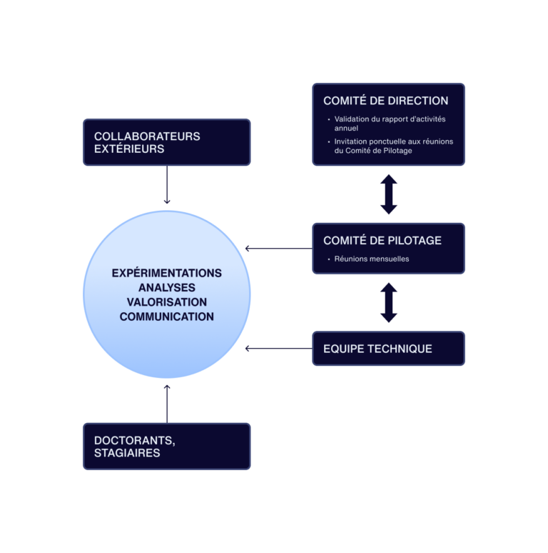 Le fonctionnement du Laboratoire Commun Jellyfish and Polyps Academy est assuré par synergie entre un comité de Pilotage, un comité de Direction, une équipe technique, des étudiants et des collaborateurs extérieurs (Figure 2).