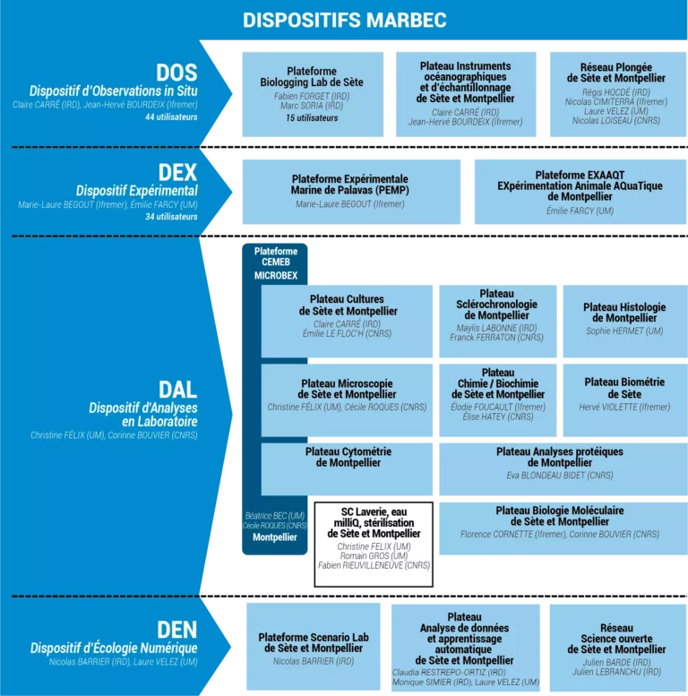 Le laboratoire MARBEC possède 4 dispositifs de recherche en appui à la réalisation des projets : le Dispositif d’Observation in Situ (DOS), le Dispositif EXpérimental (DEX), le Dispositif d’Analyse en Laboratoire (DAL) et le Dispositif d’Ecologie Numérique (DEN).